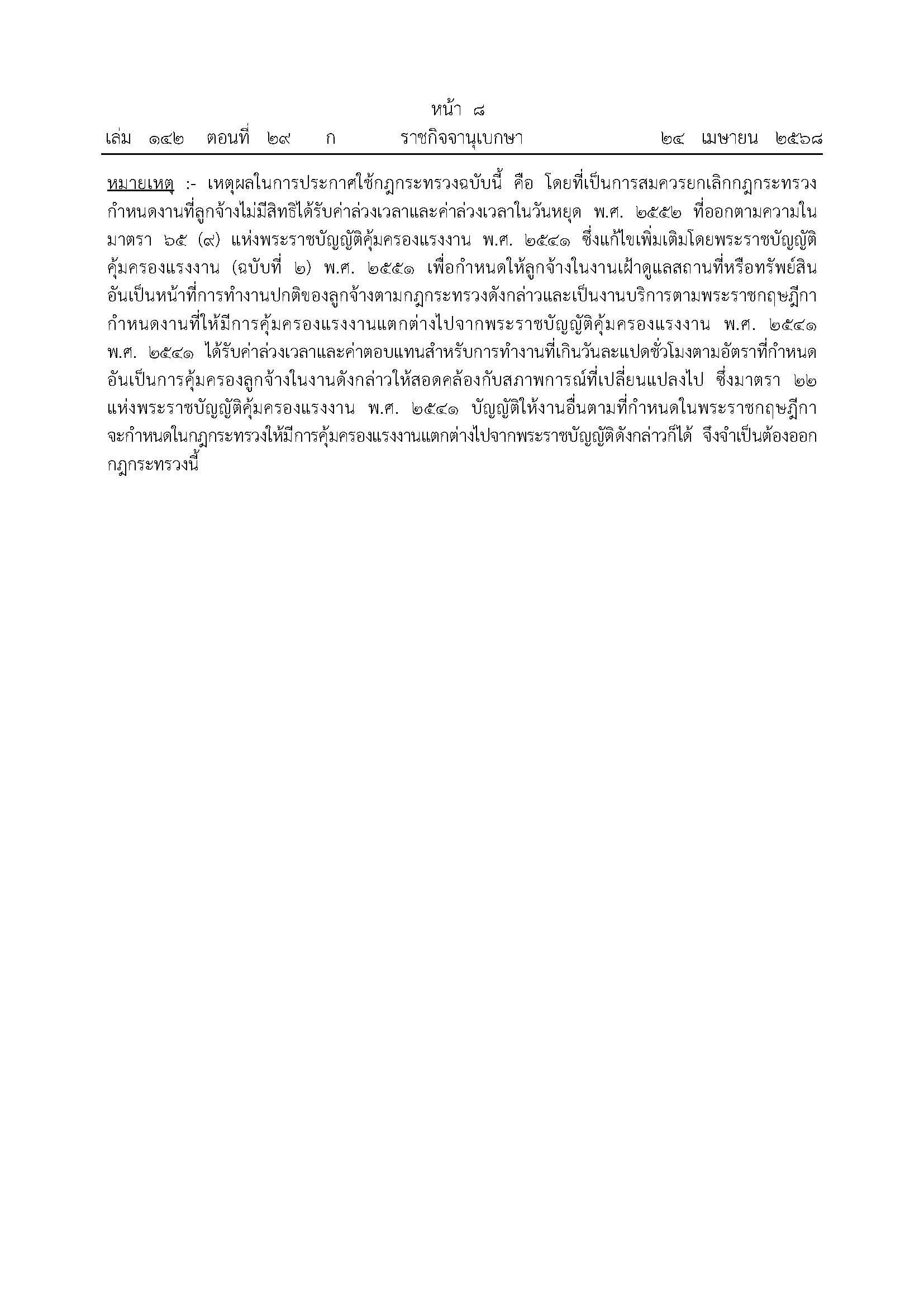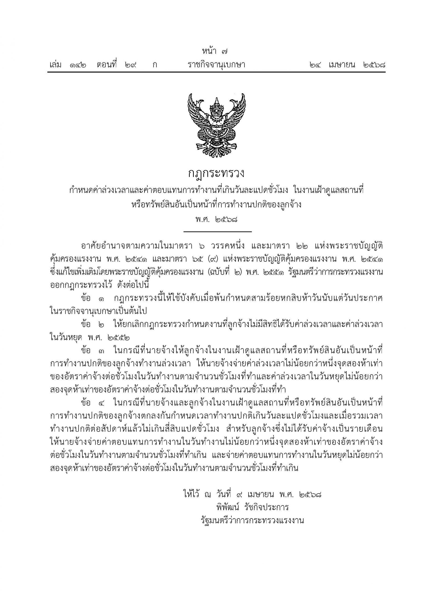 กำหนดค่าล่วงเวลาและค่าตอบแทนการทำงานที่เกินวันละแปดชั่วโมง ในงานที่ดูแลสถานที่หรือทรัพย์สินอันเป็นหน้าที่การทำงานปกติของลูกจ้าง