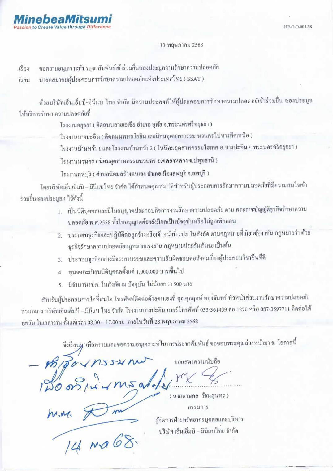 เมื่อวันที่ 14 พฤษภาคม 68 เวลา 13:00 น ฝ่ายผู้บริหารบริษัท เอ็นเอ็มบี-มินีแบ ไทยจำกัด เข้าพบ พ.ต.ประสิทธิ์ ลมสูงเนิน นายกสมาคมพร้อมด้วยคณะกรรมการฝ่ายบริหารของสมาคมผู้ประกอบการรักษาความปลอดภัยแห่งประเทศไทย